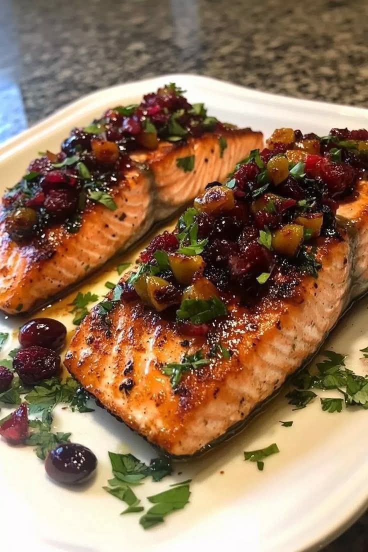 Tender baked salmon topped with a sweet-tart cranberry salsa and crunchy toasted pecans. This dish is easy to make, visually appealing, and perfect for weeknight dinners or special occasions.