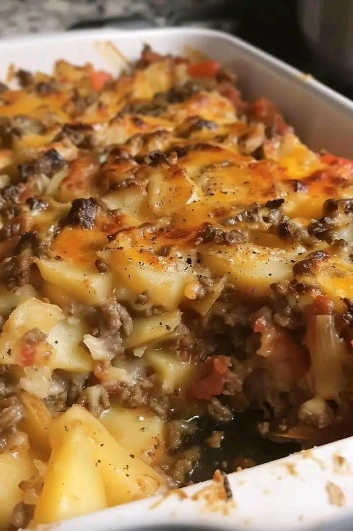 Inspired by classic steakhouse flavors, this casserole delivers bold taste with simple, everyday ingredients. The potatoes soak up all the savory juices, the beef adds richness, and the cheese ties everything together into one cozy, family-style bake that’s perfect for weeknights or special dinners.
