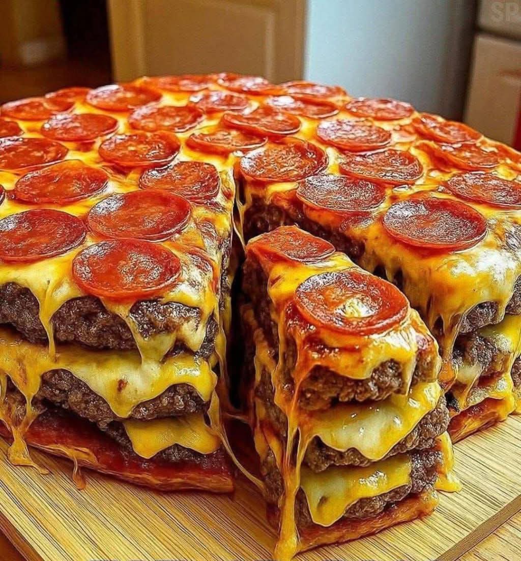 The Ultimate Double Cheeseburger Pizza Stack is a towering, flavor-packed creation that layers seasoned beef patties, melty cheddar and mozzarella, crispy bacon, and tangy pickles between two pizza crusts. Every bite delivers the best of both worlds—savory burgers and cheesy pizza—making it a crowd-pleaser and a fun recipe to assemble.